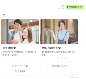 このアカウントの場合は、【デモ一覧って?】と送信されたときに、上記のカードタイプメッセージが表示されるようになっています。