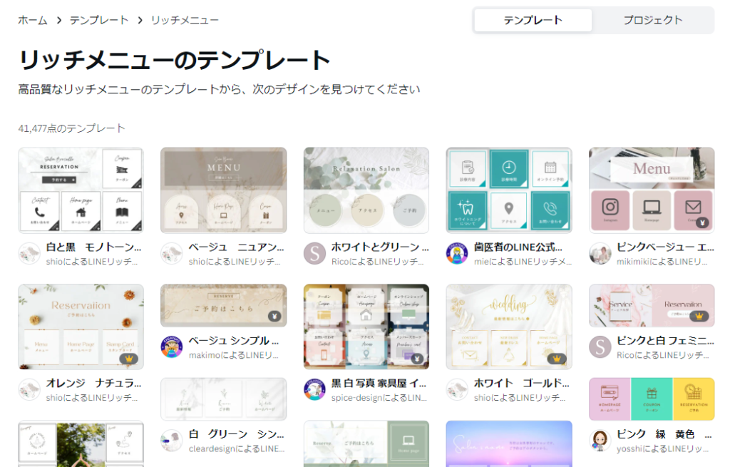 Canvaの場合は、リッチメニューと検索をすると、デザインが色々出ますのでお好きなものを選んでください。